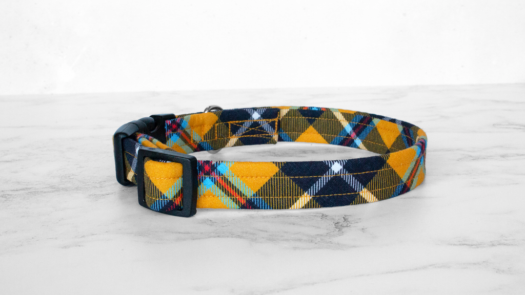 This collection of dog accessories are crafted using - a tartan designed fabric with a twist.