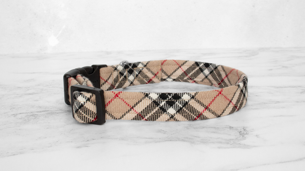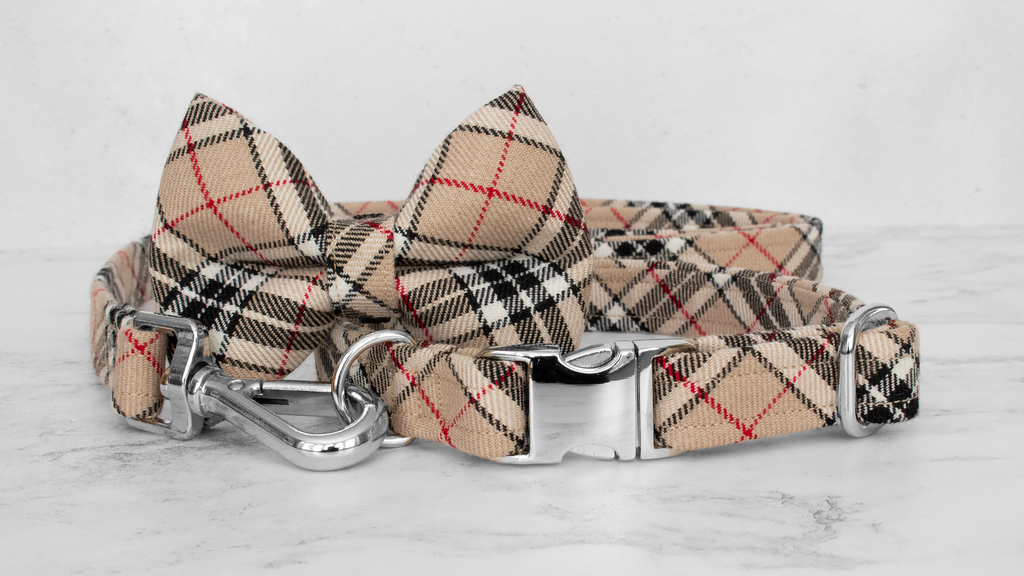 This collection of dog accessories are crafted using - a tartan designed fabric with a twist.