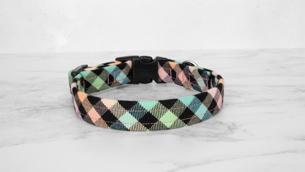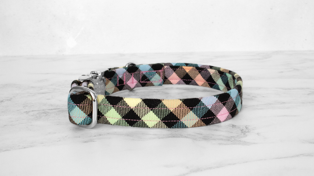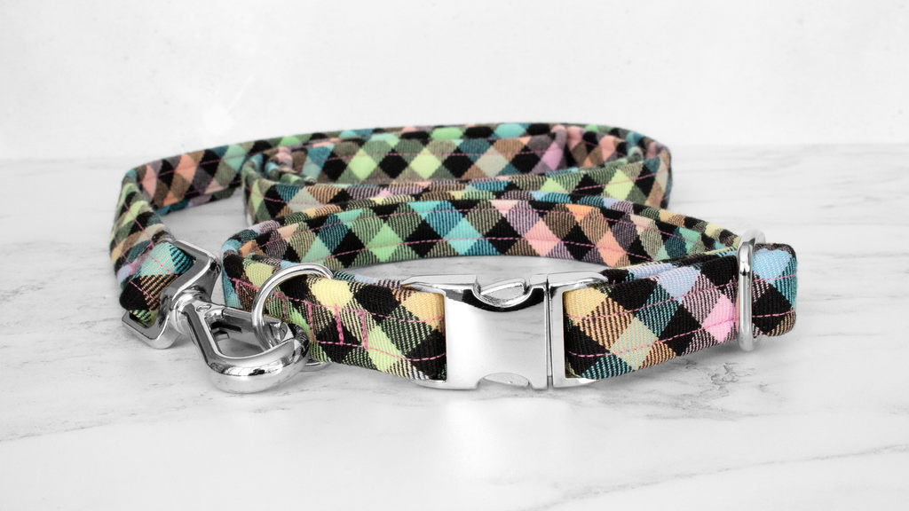 Dog Collar and Lead, Tartan with a Twist - Rainbow Checkerboard