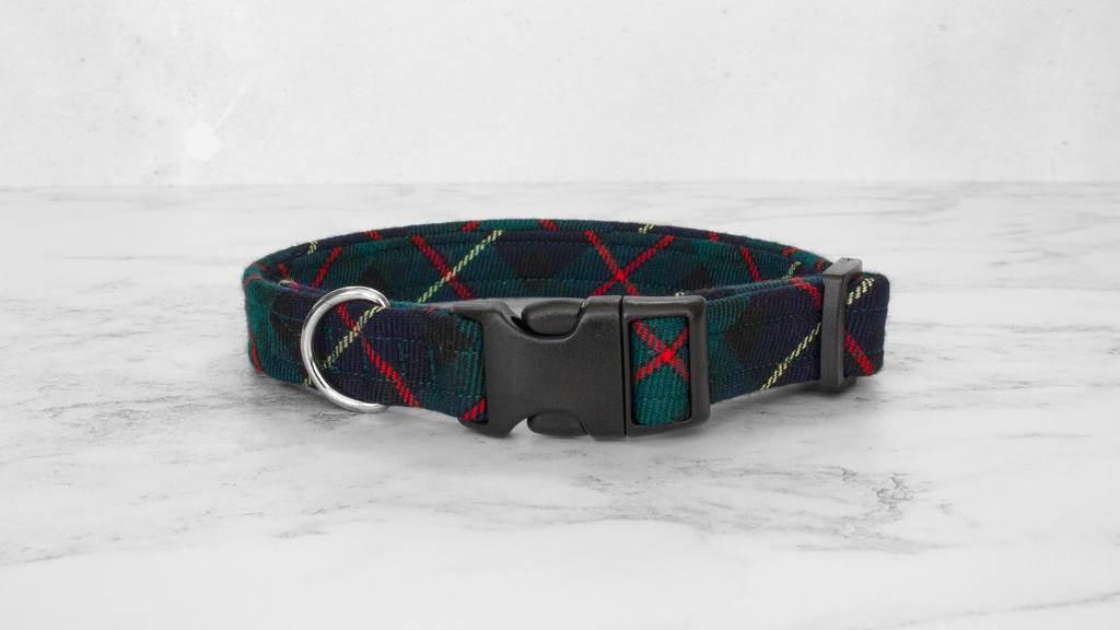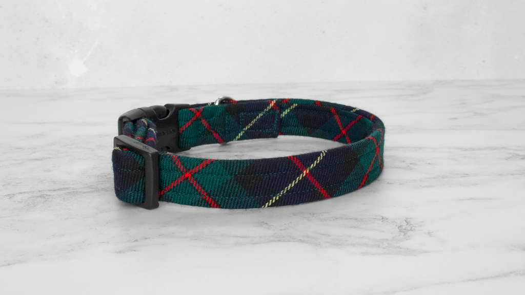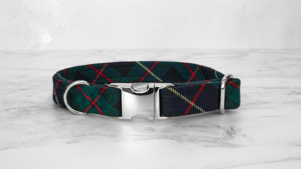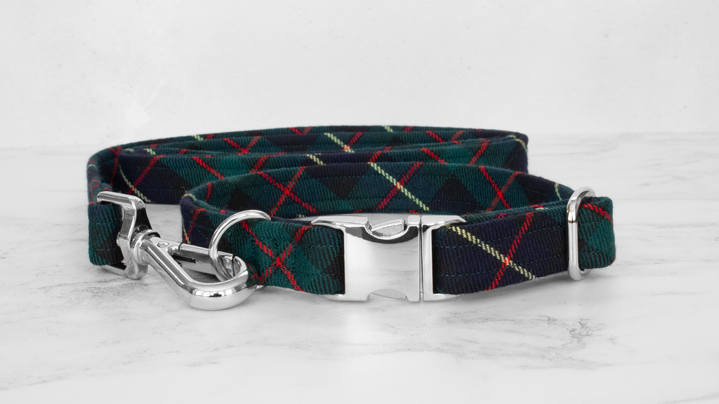 This collection of dog accessories are crafted using - a tartan designed fabric with a twist.